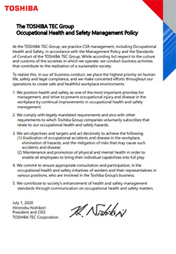 The Toshiba Tec Group formulated the “Toshiba Tec Group Basic Policy on Health and Safety” in 2004, with the intention that the top management declares their commitment to health and safety and all employees share the same commitment.
