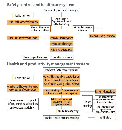 The safety control and healthcare system and the health and productivity management system of Toshiba Tec are set out as described in the chart below.