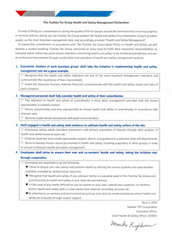 In order to improve existing safety control and healthcare activities and clearly state that the Group will promote the management that places top priority on the safety control and healthcare of employees, the Toshiba Tec Group appointed an officer in charge of the Corporate Human Resources & Administration Group as Chief Health & Safety Officer (CHSO) in October 2021, formulated the Health and Safety Management Declaration, which has clarified roles to be played in health and safety management by the management team, managers, persons in charge of health and safety, and employees, and published it under the name of CHSO.
