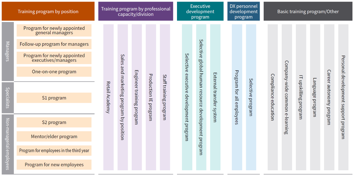 We provide training programs to establish a shared base for our employees and systems that can respond to individual needs and career characteristics.