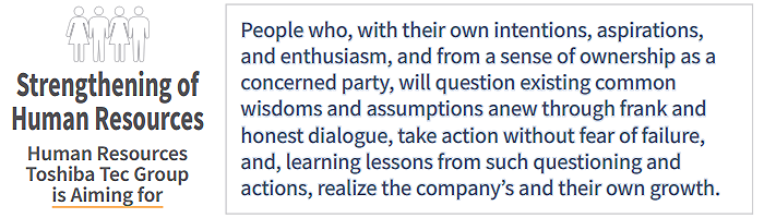 To realize our goal of being a global top solutions partner, Toshiba Tec has revised our HR vision from “an image of the kind of people we seek” to “human resources we are aiming for,” establishing a vision of what all Toshiba Tec employees, including the management team, should want to be. To draw closer to that vision, under the theme of “People are Our Assets,” we are promoting measures to support the growth of our employees.